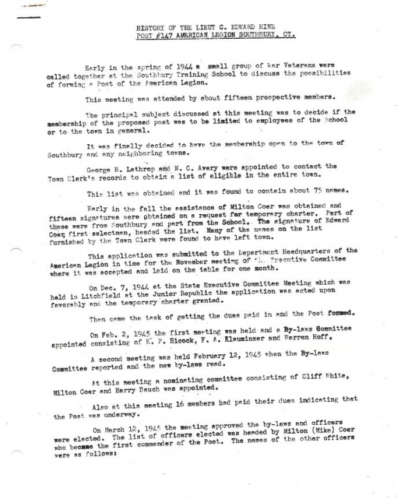 Early in the spring of 1944 a small group of War Veterans were called together at the Southbury Training School to discuss the possibilities of forming a Post of the American Legion. The meeting was attended by about fifteen prospective members. The principal subject discussed at this meeting was to decide if the membership of the proposed post was to be limited to employees of the School or to the town in general.