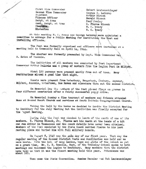 At this meeting N. C. Avery and George Lathrop were appointed to a committee to arrange for a Public Meeting for Instituting the Post and installing officers. The Post was formally organized and officers were installed at a meeting held in the Community Hall on April 14, 1944. The charter was formally presented by Dept. Vice Commander Wm. A. Eaton of Ansonia.