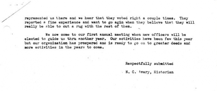 We now come to our first annual meeting when new officers will be elected to guide us through another year. Our activities have been few this year but our organization has prospered and is ready to go on to greater deeds and more activities in the years to come.